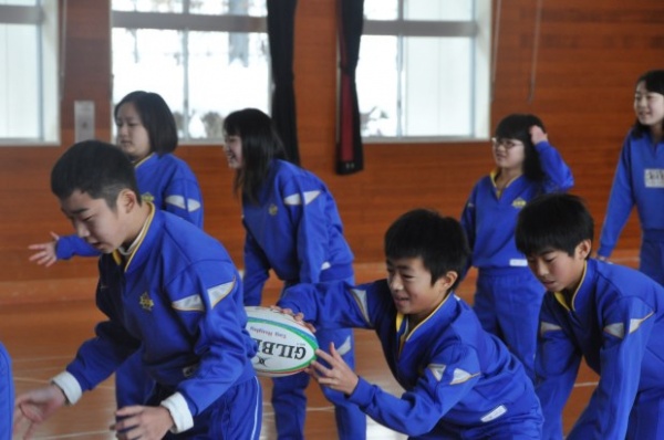 また、講話の終了後は、選手がパスやリフティング、タックルなどのプレーをデモンストレーションし、子供達の代表もチャレンジ。その後は、ラグビーボールを使ってゲームを楽しむなど、ラグビー体験も行いました。